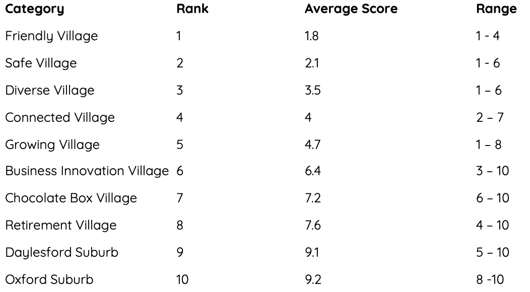 In a reassuring level of agreement in the community, an initial analysis of the just over 50 completed 'Choose your Village!' forms showed very strong support for a friendly and safe village, and very little support for the concept of being a suburb of .... anywhere!